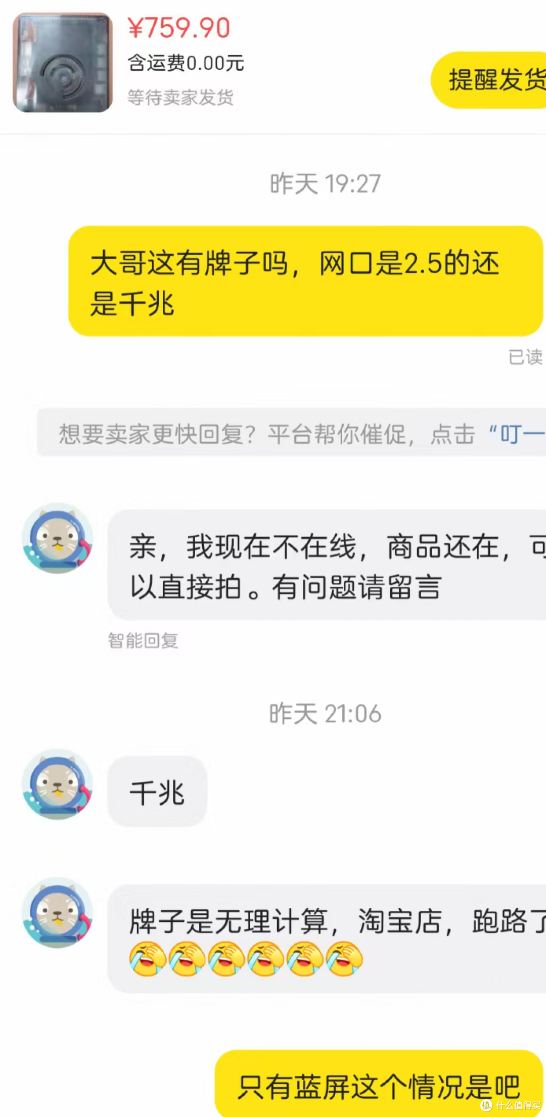 即然如此,那么高低也得去问问尝尝咸淡,问了一下大哥,说是双千兆,然后牌子是无理计算,店铺跑路,那咱们都买这个了,保修啥的默认不存在就行了。