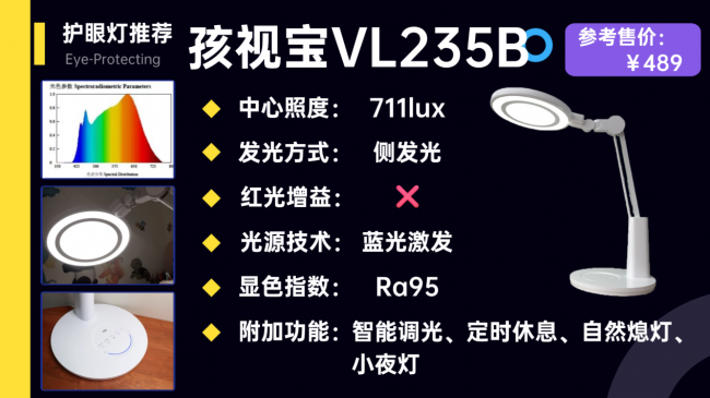 儿童护眼灯什么牌子性价比高?孩视宝VL235B色温支持在3400K到4150K之间调节,能够兼顾专注学习和放松阅读等不同场景,同时还加入了智能感光功能,可根据环境亮度自动调整光线强弱,减少手动调节的麻烦,并提供15分钟自然入睡模式,夜间使用更舒适。不过在护眼核心上,它依旧采用蓝光激发全光谱方案,蓝光峰值接近1.0,护眼能力偏基础,更适合注重照明体验与功能实用性的家庭选择。