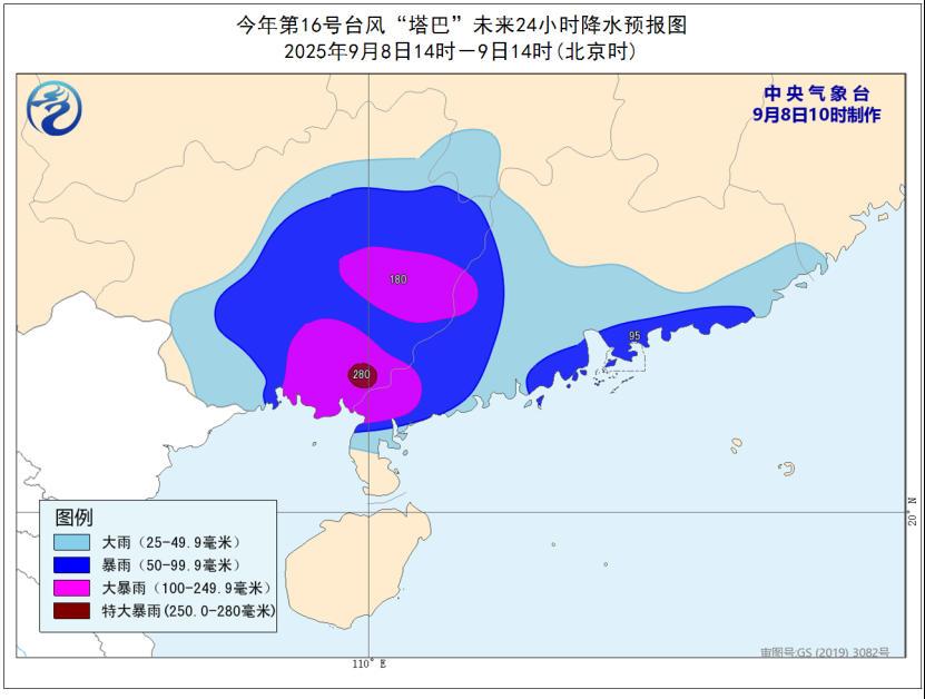 据中央气象台预计,今明两天,台风“塔巴”将给广东、广西等地及南海海域带来强风雨天气。其中,南海海域今日仍有大风,预计明日风力减弱,广东今天进入最强降雨时段,广西降雨最强时段将出现在9日,群众需要及时做好防范措施。