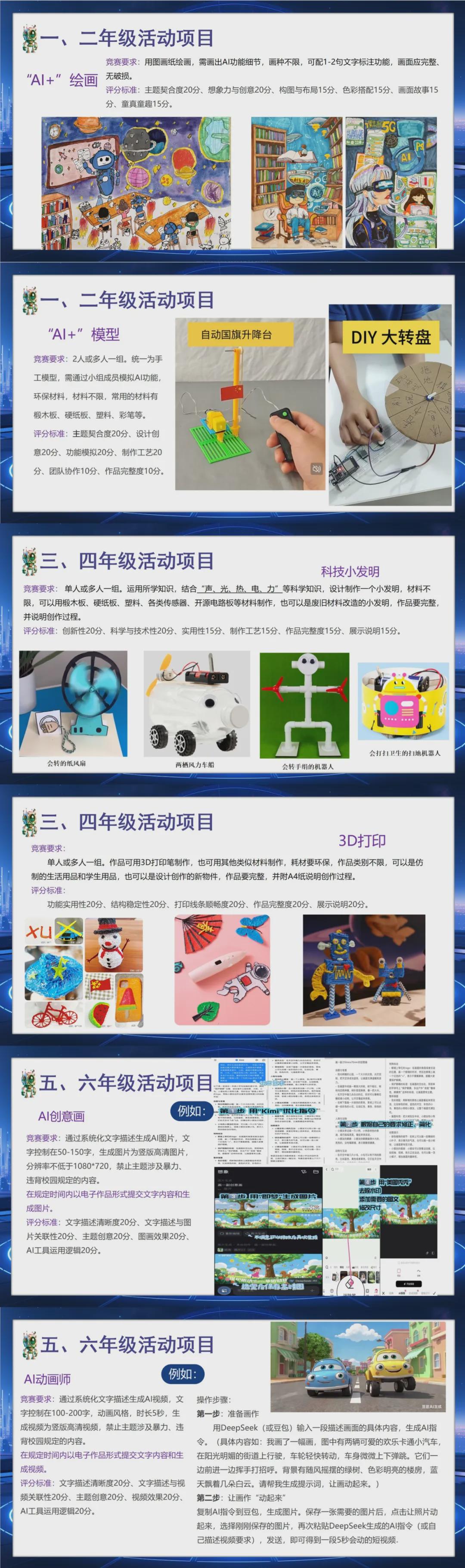 本届科技艺术节注重全员参与、分层设计,根据不同学段学生的特点,设置了丰富多样的主题竞赛项目: