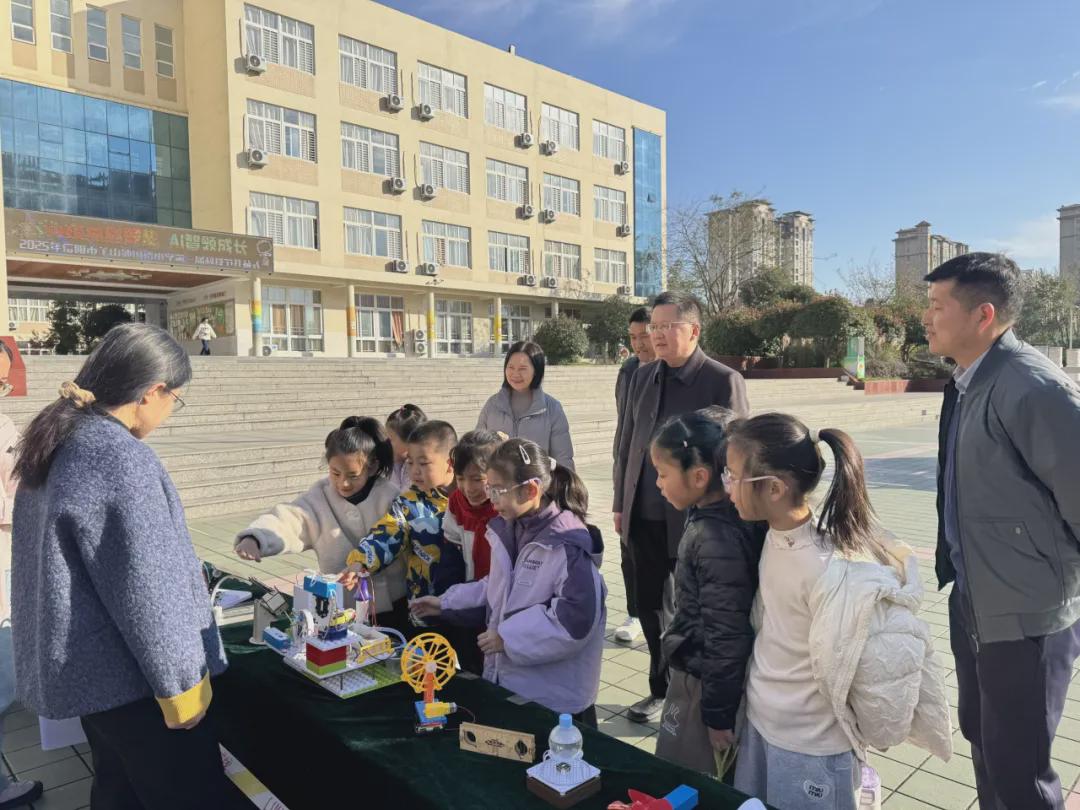 展览区内,孩子们创作的AI绘画、智能模型、3D打印作品和编程动画琳琅满目,吸引了不少同学驻足围观。学生们穿梭其间,小脸上洋溢着兴奋与自豪,不时指着作品热烈讨论,现场洋溢着浓厚的科技与艺术氛围。领导老师们也在参观过程中频频点头,对同学们将AI技术与艺术创意紧密结合的能力表示高度赞赏,尤其肯定了大家展现的探索精神和综合素养。