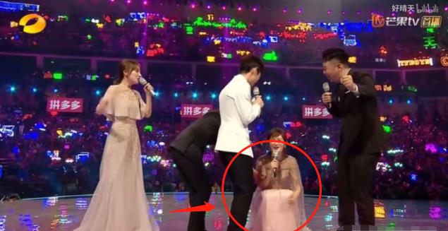 在某大型晚会直播现场,她身穿晚礼服,突然蹬地不起,嬉笑耍乐,好似家常。