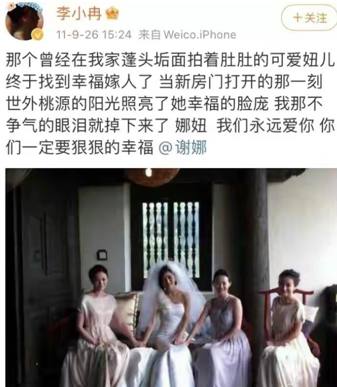 2011年,谢娜与张杰官宣婚讯,闺蜜李小冉特意向剧组请假,从北京飞去香格里拉,亲自给好友当伴娘。