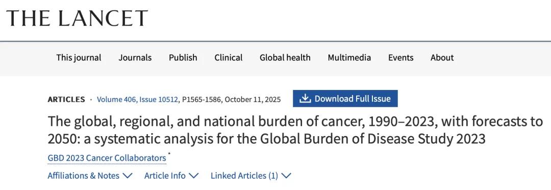 ①GBD 2023 Cancer Collaborators. The global, regional, and national burden of cancer, 1990-2023, with forecasts to 2050: a systematic analysis for the Global Burden of Disease Study 2023. Lancet. 2025 Oct 11;406(10512):1565-1586.