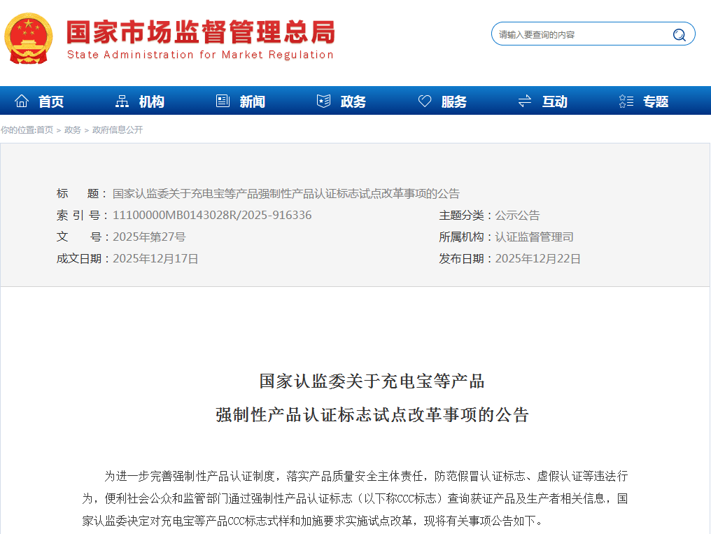 市场监管总局(国家认监委)发布《国家认监委关于充电宝等产品强制性产品认证标志试点改革事项的公告》,对充电宝、燃气燃烧器具、电动自行车等高风险产品实施CCC认证标志试点改革。