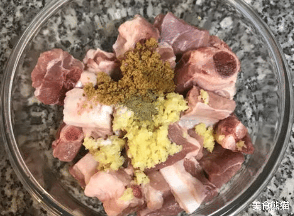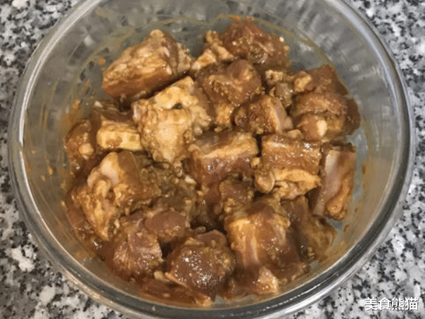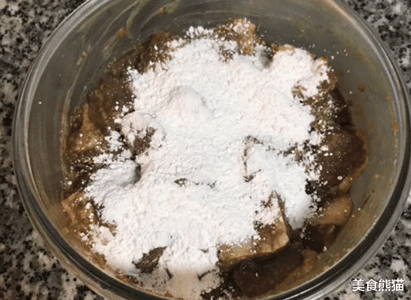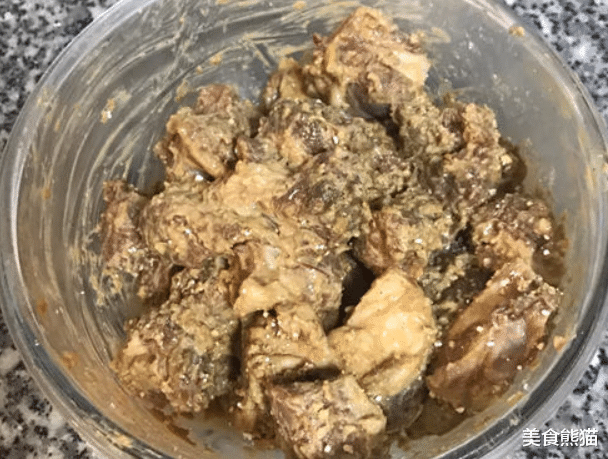 5、两小时后,起油锅,温度不用高;取出排骨,舀入生粉混全后搅拌均匀;