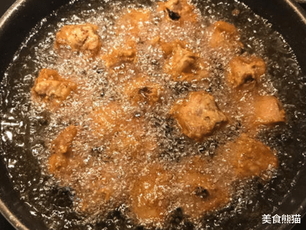 6、油温大7成热是放入排骨时,排骨旁边会起大泡泡即可,中小火慢炸;