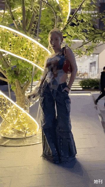这条裤子的腰部非常贴合她的身材,但裤脚却长到拖地,每走一步都可以把附近的地板都拖干净。