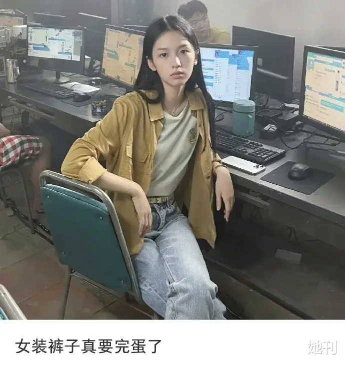 坐在电脑前的她,复古又少年感十足,但高高顶起的牛仔裤三角区,却带来了一种奇怪的“氛围感”。