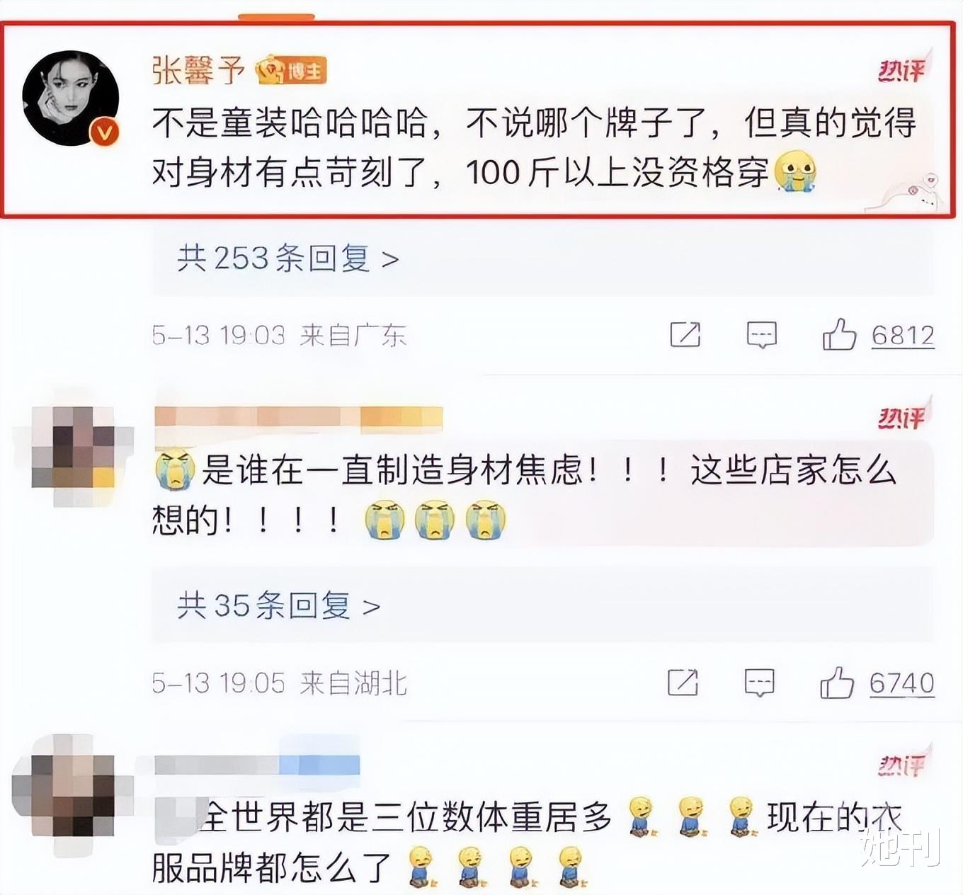 再以女星张馨予为例,她身高169厘米,体重常年维持在102斤左右,可有一个她非常喜欢的品牌,成年女装的尺码比童装还小,即便是最大号她都无法穿上。