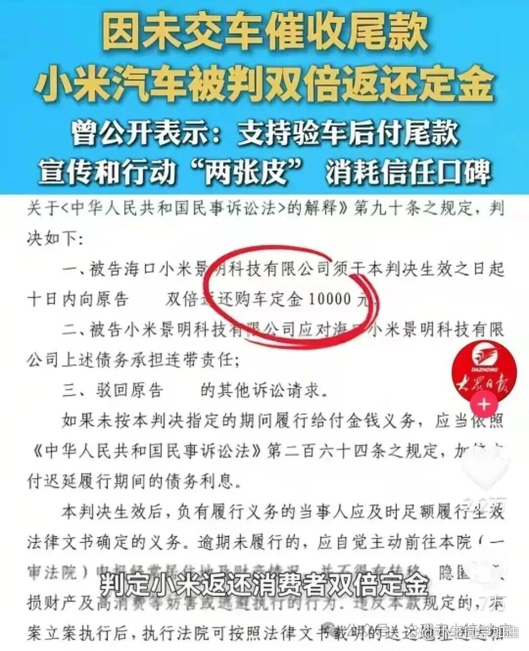 事情的起因是一起法院判决:王先生去年订了辆小米SU7,交了5000元定金后,收到通知“7日内必须付完尾款,否则定金不退”,但此时他连实车都没见过,更没验车。王先生不服起诉,法院最终判小米败诉,要求退还定金。新华网紧接着发文评论,核心就一句:“创新不是车企搞‘霸王条款’的借口,消费者权益才是底线!” 今天咱们就扒透:小米这销售套路到底有多坑?新华社为啥要专门点名?