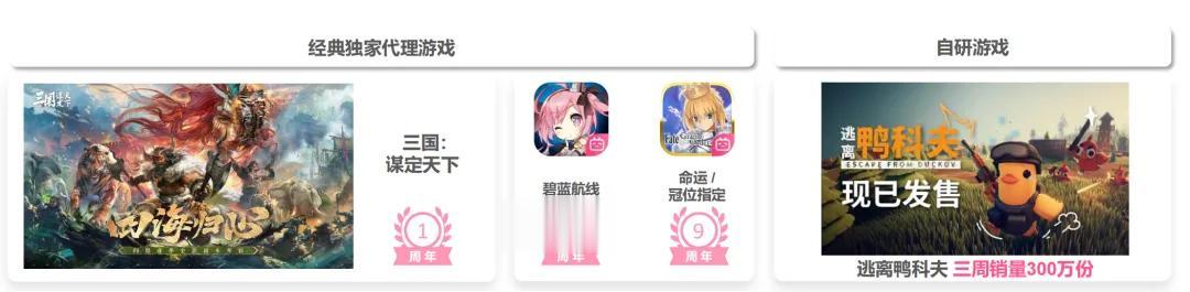 财报将去年游戏业务营收增长,归因于《三国:谋定天下》的带动,和自研产品《逃离鸭科夫》的上线;同时,公司代理的《命运/冠位指定》《碧蓝航线》等长青游戏保持了相对稳健的收入表现。