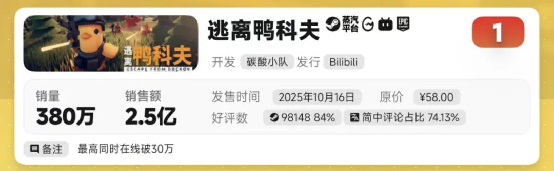 其中搜打撤题材PC单机游戏《逃离鸭科夫》,可以说是去年国内市场最畅销的国单。游戏由B站旗下碳酸小队研发,上线3周游戏销量突破300万,还获得了2025金葡萄奖年度最佳创新游戏、年度最佳独立游戏两大奖项。