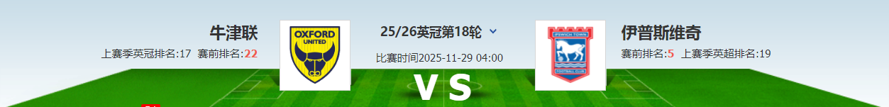 英冠第18轮即将打响,本场比赛由牛津联迎战伊普斯维奇,牛津联本赛季目前取得了3胜6平8负的成绩,积15分排在积分榜第三位;伊普斯维奇目前取得了7胜6平3负的成绩,积27分排在积分榜第5位。
