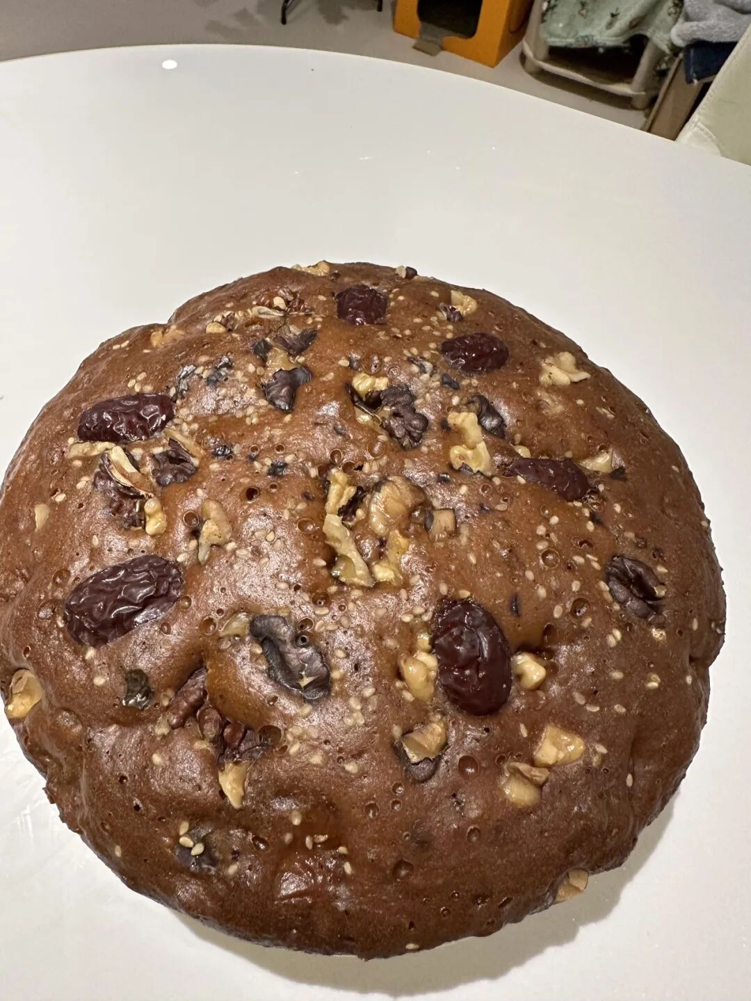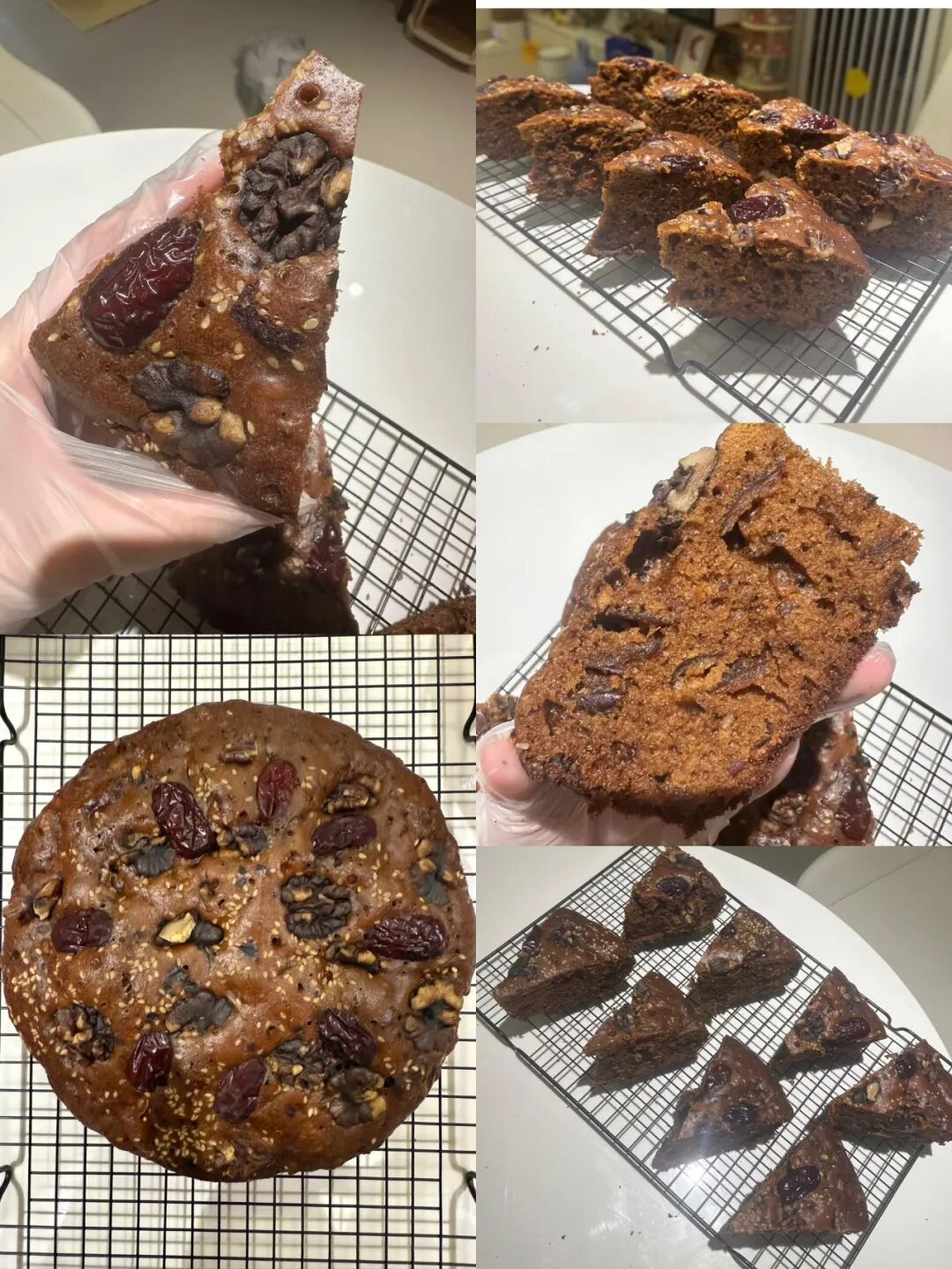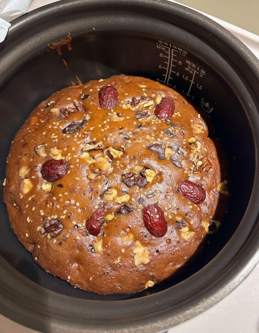 倒入电饭煲,撒上白芝麻,核桃碎,红枣片,按煮饭键焖1个小时,放凉以后倒扣出来切片,就大功告成了。