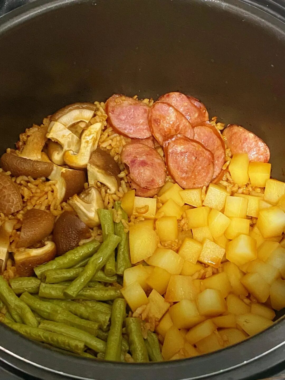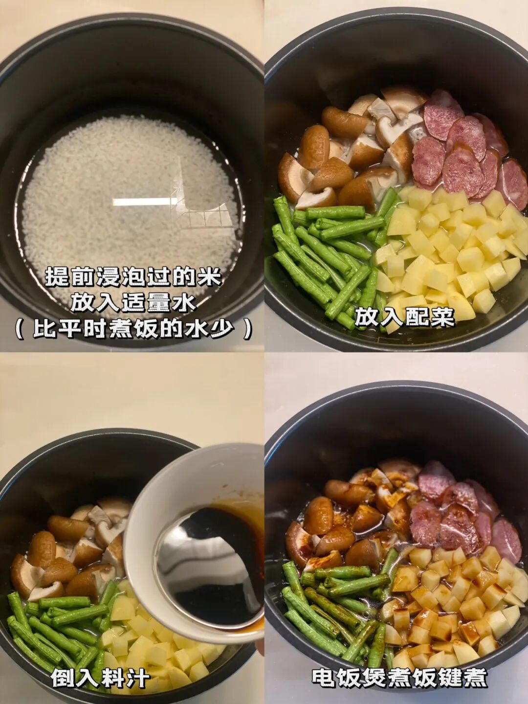 放入配菜,倒入料汁,电饭煲煮饭键即可。