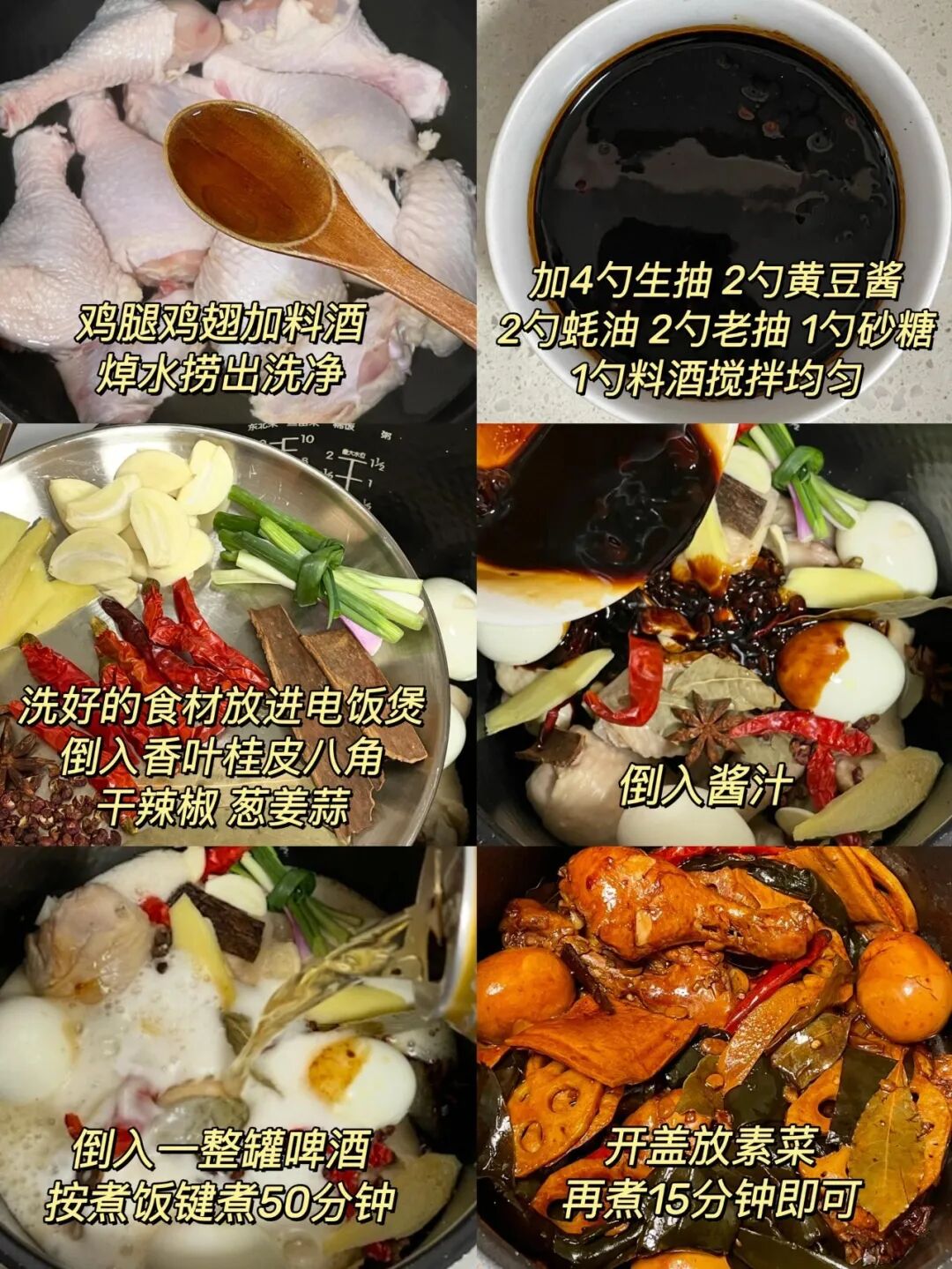 调好料汁,倒入,再倒入一整罐啤酒,按煮饭键煮50分钟。