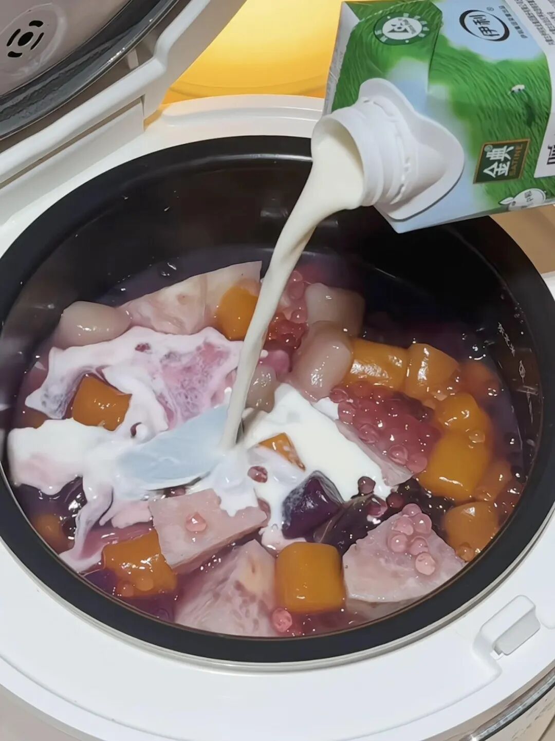 除牛奶外,所有材料放入电饭锅。