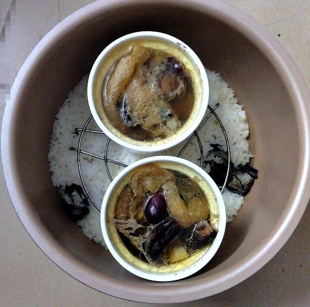 在饭上面放架子再放炖盅,注意不要直接把炖盅放在饭上面,会把饭压实了。