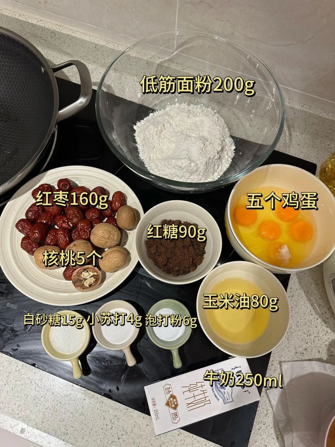 食材准备:低筋面粉200g,红枣160g,核桃5个,鸡蛋5个,红糖90g,白砂糖15g,小苏打4g,泡打粉6g,玉米油80g,牛奶250ml 。