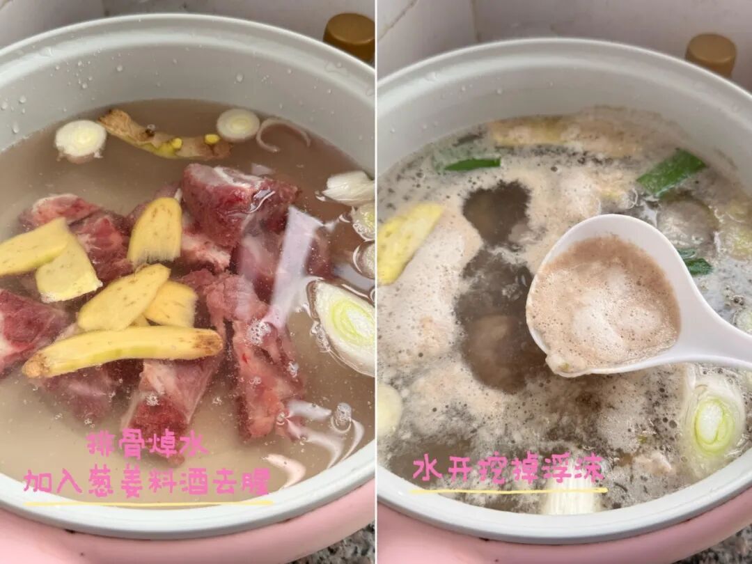排骨放锅里焯水,加入一些料酒,几片姜、葱段去腥。