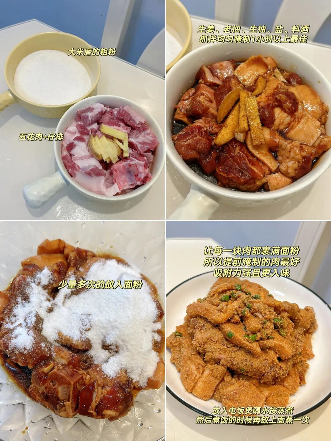 先把五花肉或仔排,用生姜、老抽、生抽、盐、料酒抓匀,腌制1个小时,让肉充分入味。然后少量多次撒上米粉,用手抓匀,确保每一块肉都裹上厚厚的米粉。