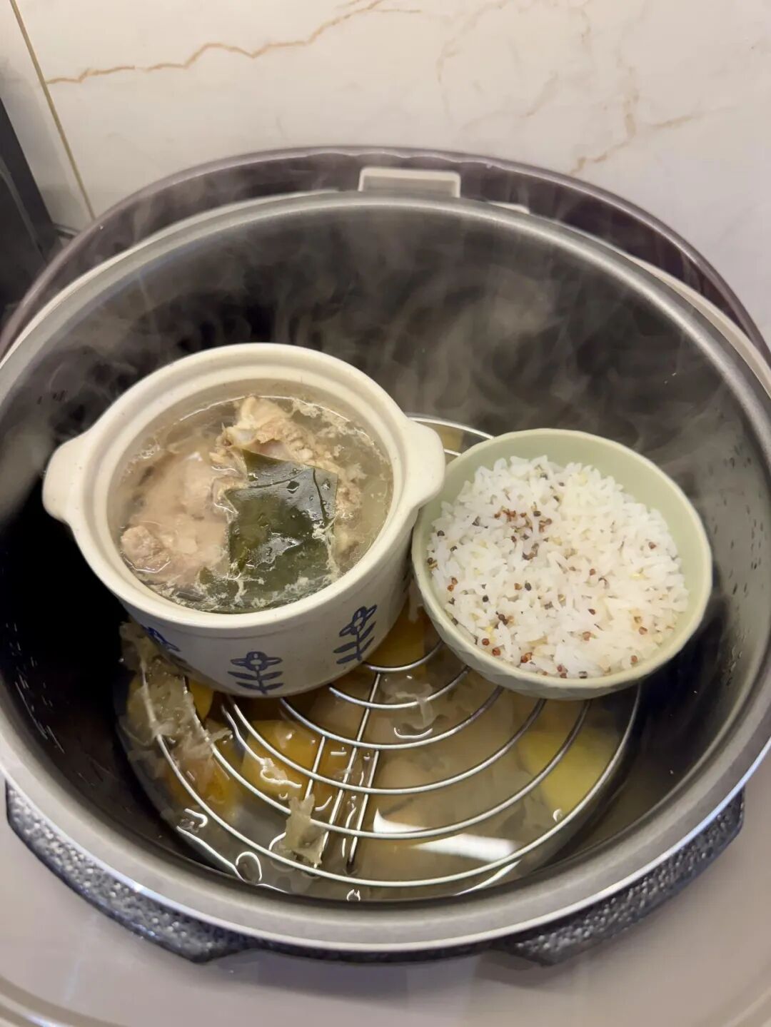 由于平常下班回家没有时间煮汤,就想着把汤和饭一起蒸,想不到真的成了。用时50分钟,口感对比用锅煮的50分钟的汤,蒸出来的口感更好。省时加好喝,且量合适。