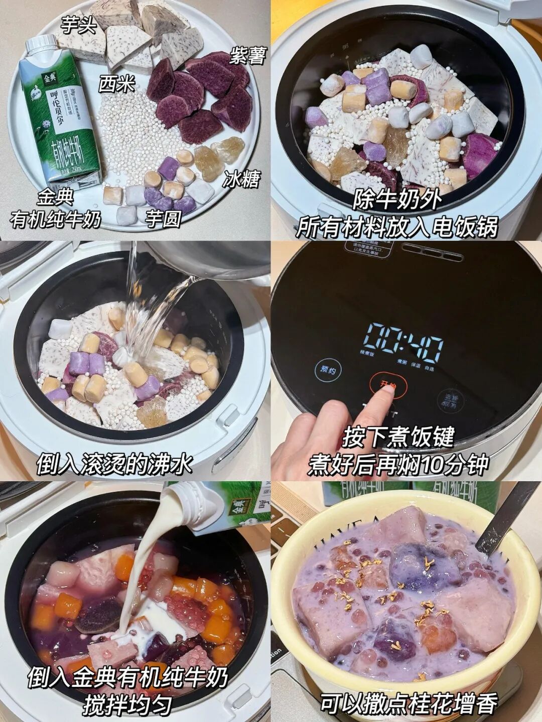 牛奶、芋圆、西米、芋头,冰糖、桂花。