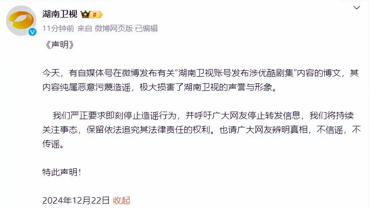 面对这突如其来的风波,“当事人”之一的湖南卫视当然坐不住了。没多久,他们就发布了声明,言辞凿凿地说这是恶意造谣,严重损害了他们的声誉,还扬言要追究法律责任。好家伙,这声明一出,湖南卫视声明 又是一个热搜。这架势,难道是想把这“战火”彻底熄灭吗?