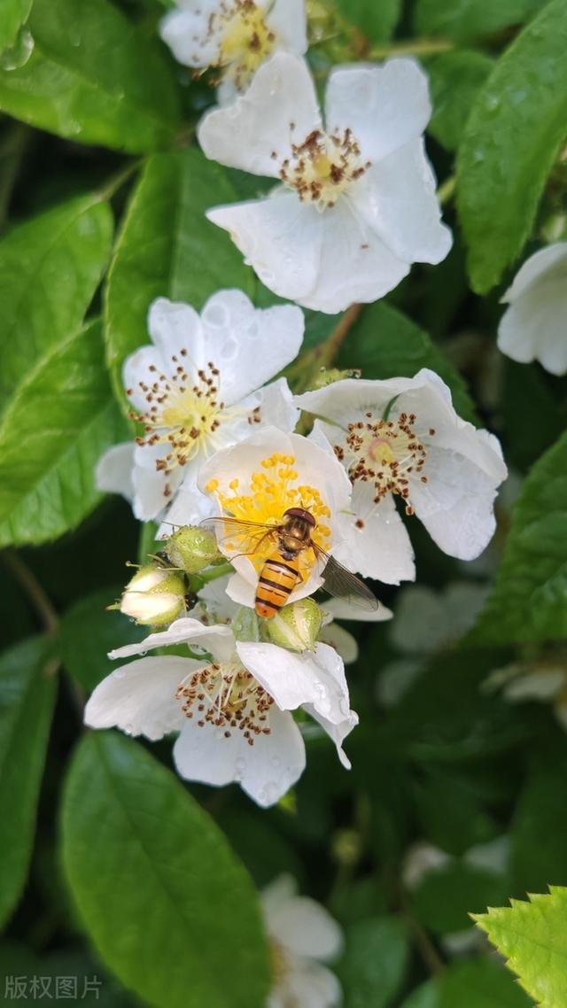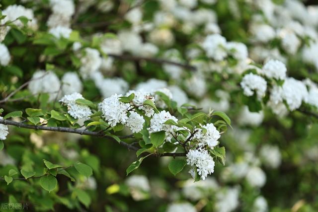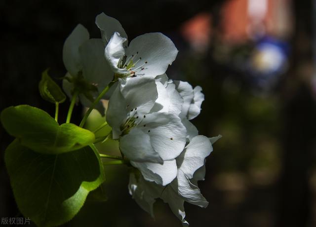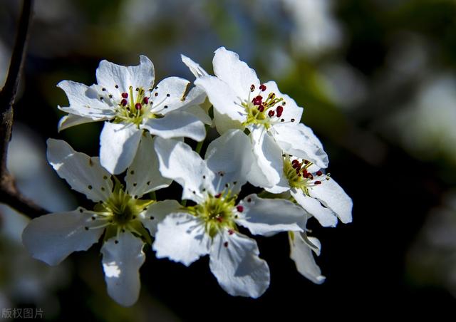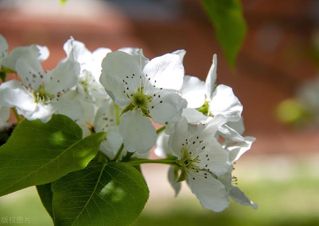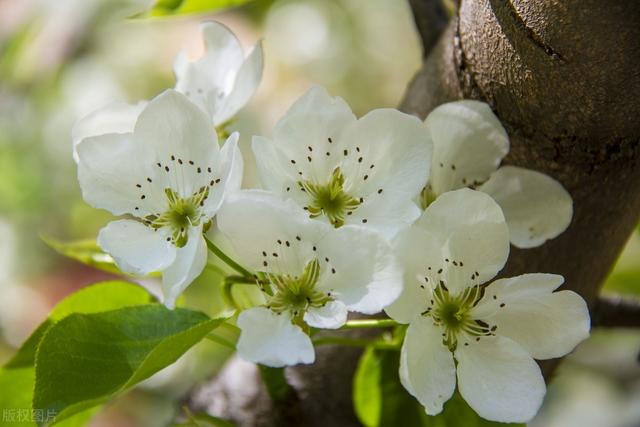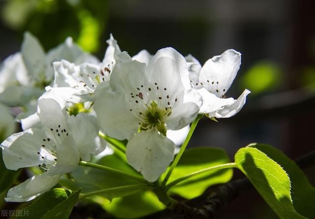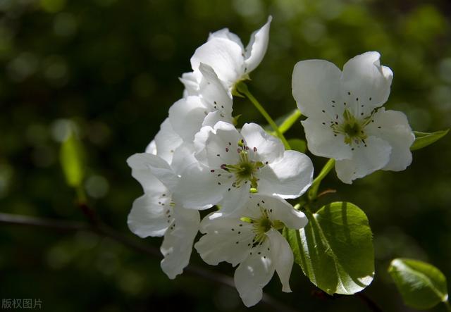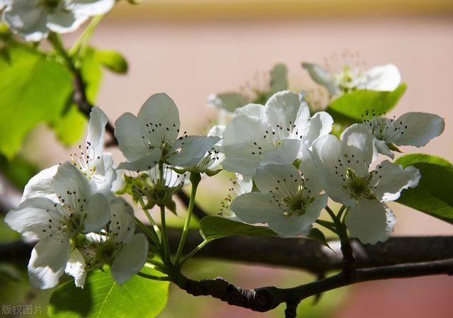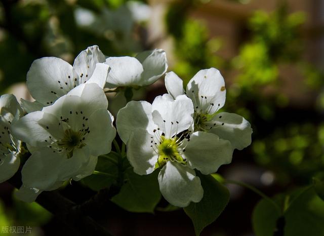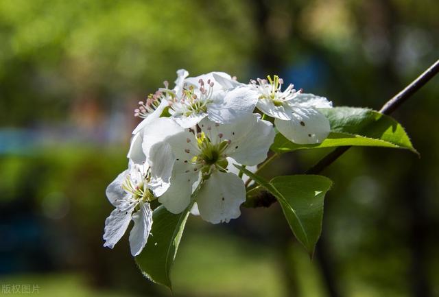 走近细看,盛开的梨花花瓣薄如蝉翼,晶莹剔透,上面还挂着几滴晶莹的露珠,宛如珍珠般闪耀。它们有的含苞待放,羞涩地躲在绿叶后面;有的则完全绽放,尽情展示着自己的美丽。