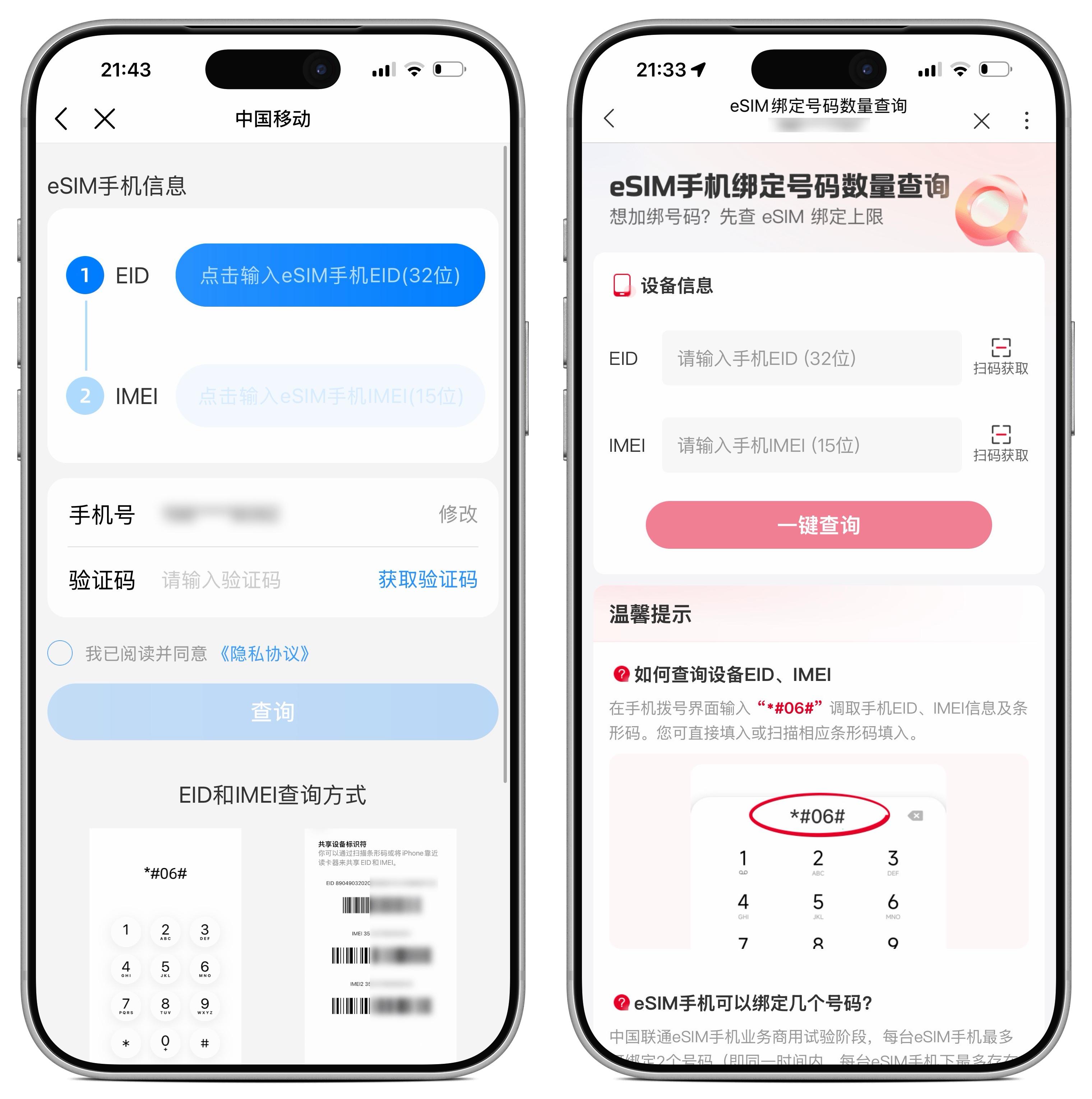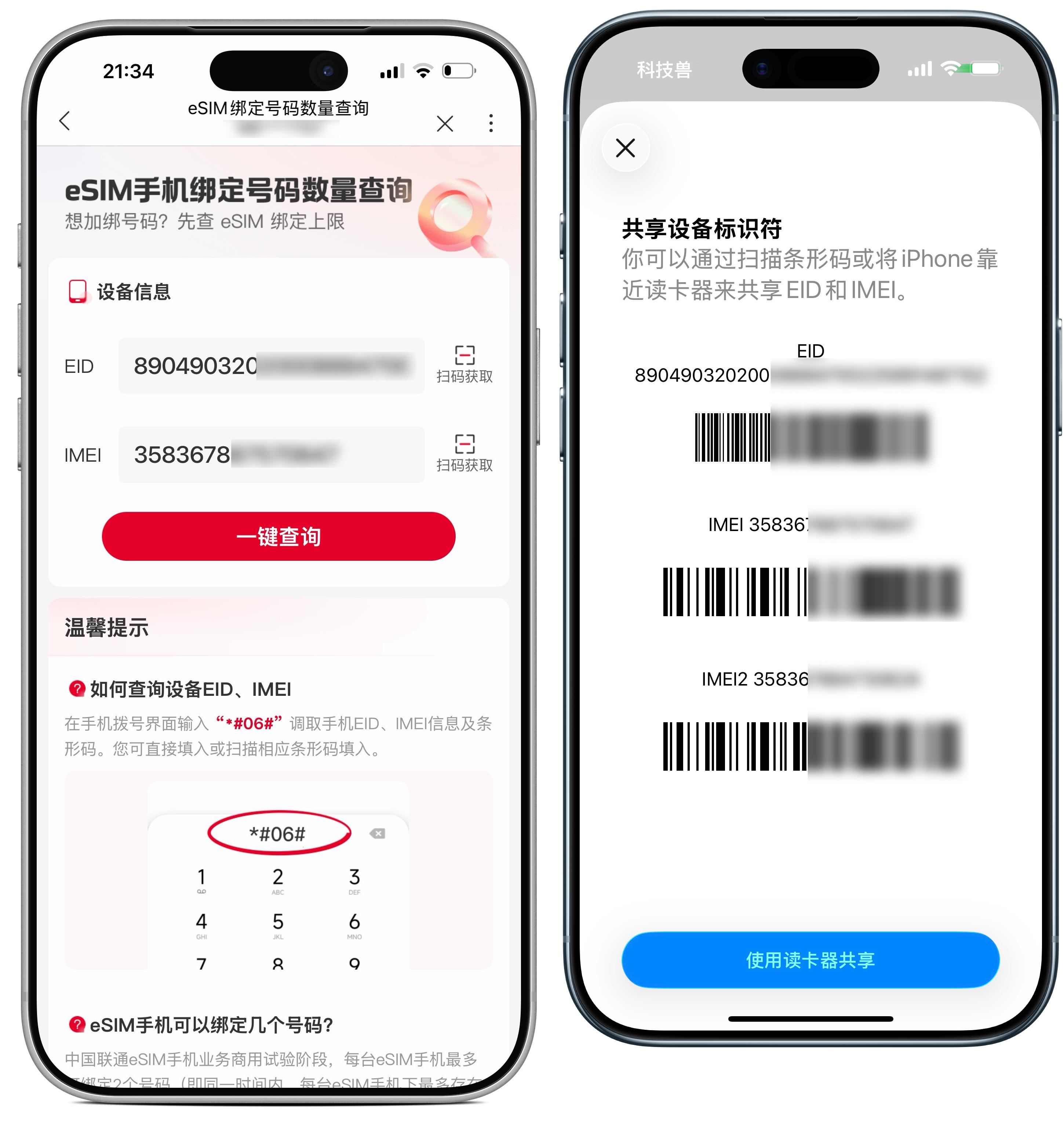 接着填写手机的 IMEI(终端串号)和 EID(eSIM 芯片序列号),建议通过扫码填写(拨号盘输入 *#06#,就能看到 IMEI 和 EID 以及对应的条码。)
