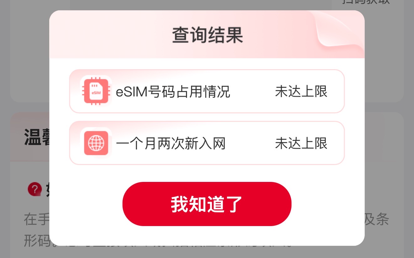 查询完成后,页面会显示这台设备当前的 eSIM 绑号情况,以及是否达到了一个月两次的入网上限。
