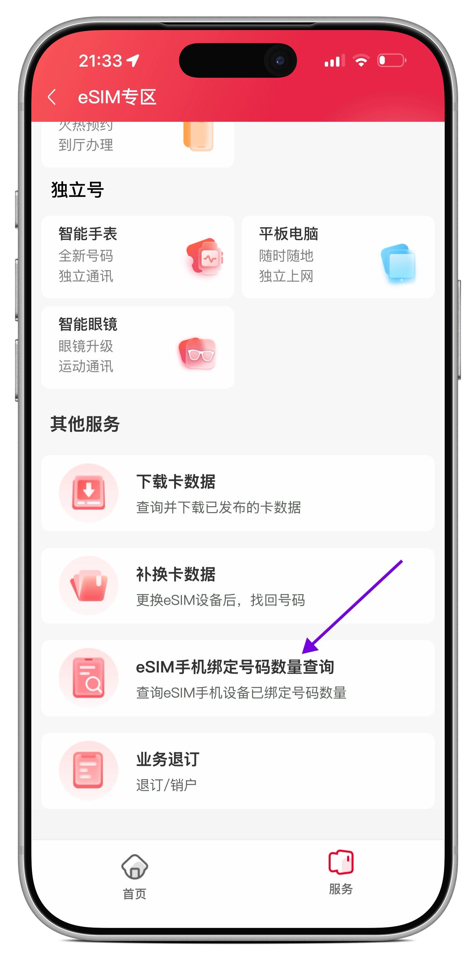 进入「中国联通」App 搜索“eSIM”进入专区,找到「eSIM 手机绑定号码数量查询」入口。