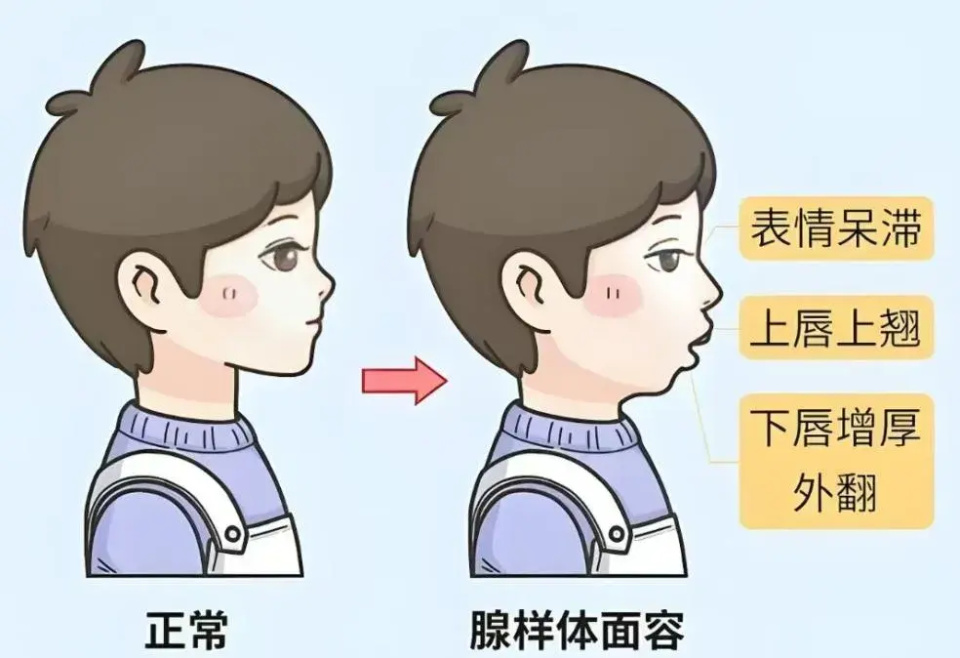 ➤长期张口呼吸还会引发“腺样体面容”,导致面部发育畸形。