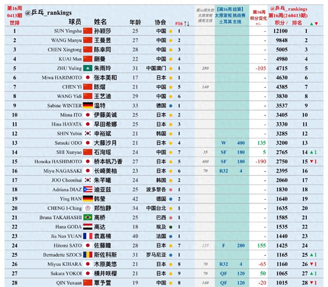 随着WTT太原挑战赛的结束,新一期的女乒世界排名又有了变化。世界排名前十的选手都没有排名变化,但是有积分的变化。朱雨玲去年的积分到期,减掉了105分,以4715分排名世界第五。排名前四的依然是国乒选手,这些选手刚刚参加完世界杯,所以都没有新的积分入账,保持排名不变。
