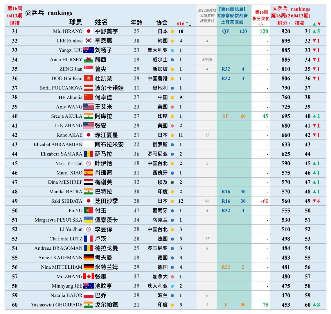 印度选手阿库拉在土耳其支线赛事打进了四强,获得45个积分,排名上升两位来到了第40名。芝田沙季被国乒选手朱梓予击败止步16强,减掉60个积分之后下滑了四个名次,目前世界排名第49位。印度选手戈尔帕德增加75个积分排名上升了八位,目前排名第60位。