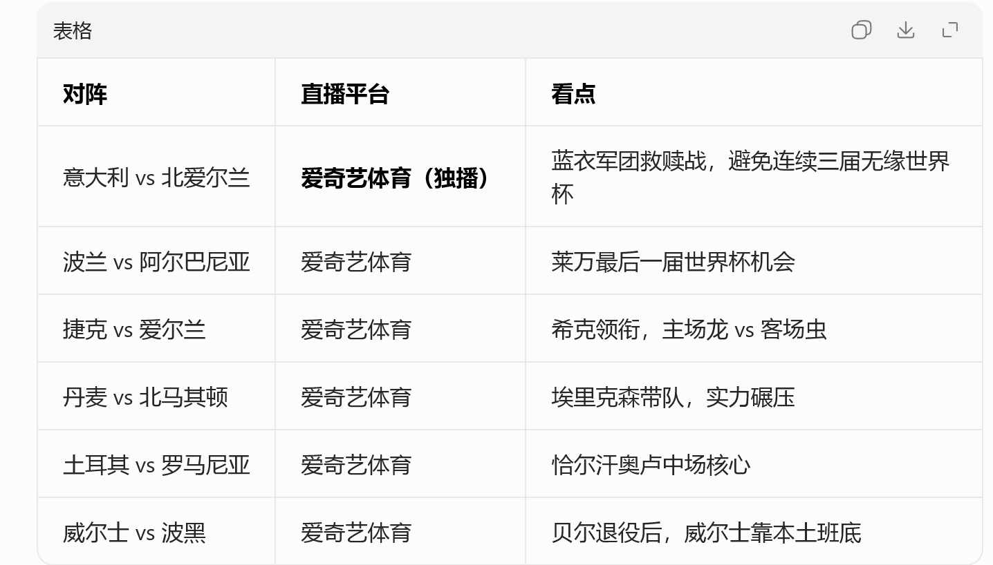 二、赛事杂谈单场淘汰的残酷美学欧洲附加赛全是 “一战定生死”,没有容错空间。意大利、波兰、威尔士等豪门都站在悬崖边,这是世界杯前最刺激的剧情。