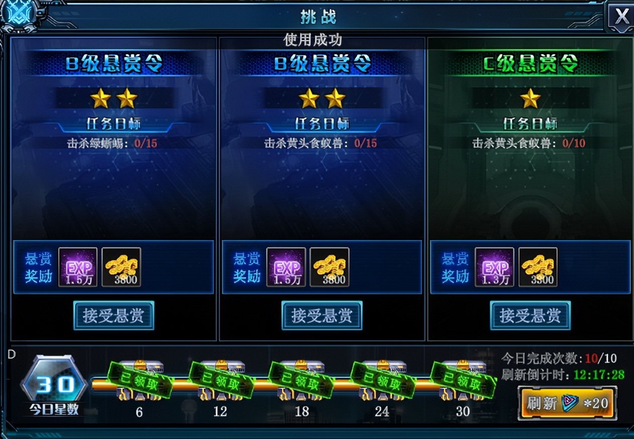 任务规则:每天你固定能接10次任务。任务等级按照收益从低到高,分成C、B、A、S四个级别。每天你有3次免费刷新任务的机会,要是你对当前的任务等级不满意,就可以用“绑定能量晶石”来刷新任务列表。
