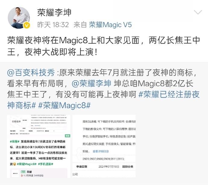 继日前,荣耀终端股份有限公司CEO @荣耀李建 官宣预热了Magic8系列新机不但拥有史上最强硬件+最强AI智能体,而且还具备AI自进化能力等信息之后,网间有数码博主还曝出了 @荣耀手机 已经注册了“荣耀夜神”商标的消息,对此,荣耀终端股份有限公司旗舰手机产品经理 @荣耀李坤 不但确认了该消息,而且透露,该技术将由Magic8系列首发,并且将配备2亿像素潜望长焦。