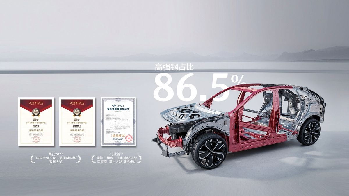 材料工艺的突破更具战略意义。与宝钢联合开发的1470MPa冷冲压钢,打破“热成型钢才能达超高强度”的行业惯性,车身86.5%高强钢与27.45%热成型钢的组合,配合7横5纵笼式铠甲结构与全系标配9气囊,构建起移动的“安全堡垒”。这种从材料到结构的全链条创新,让EZ-60斩获2025“中国十佳车身”与“最佳材料奖”,重新定义合资智造的安全标杆。