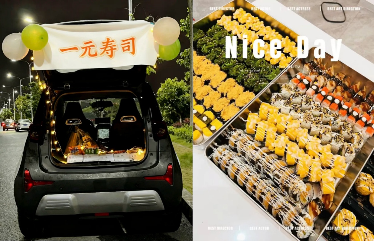 小蚂蚁的后备厢在小蚂蚁车主的眼中,就是能把创意、想法变成真金白银的百宝箱。一位车主将爱车改成移动寿司摊,他说,"把奇瑞小蚂蚁改成移动寿司摊也太香了!铺原木色防水垫,挂串灯,后备厢秒变操作台,氛围感直接拉满!”