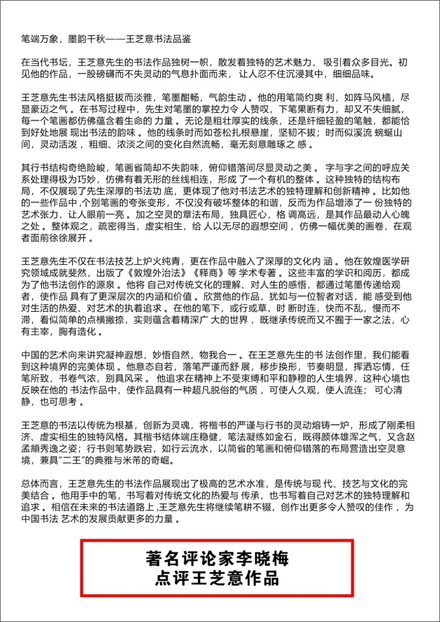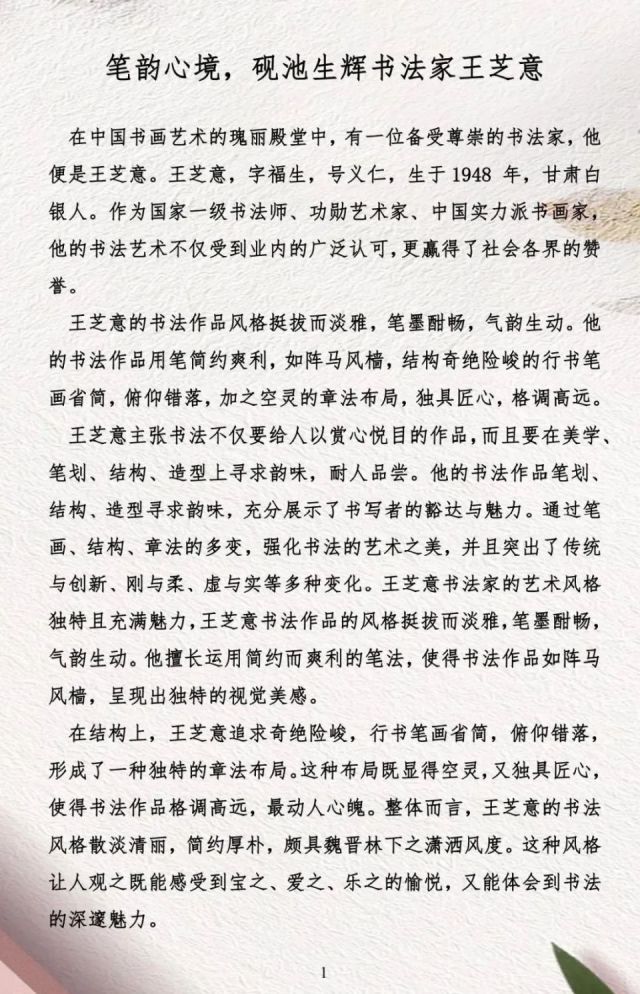 王芝意,字福生,号义仁,生于 1948 年,甘肃白银人。中国楹联学会会员,中国高级书画创作师、中国国家一级书法师、中华人民共和国书法大家、国际殿堂级艺术大师、世界文学界功勋艺术家、CCTV 央视书画频道签约艺术家、中国实力派书画家、高级工程师。现任中国书画家协会副主席,中央美术学院书法系客座教授、中国硬笔书法协会副教授、国宝级央新名人档案:“特聘名誉主席”、中国书画艺术非遗传承委员会常务副主席、中央电视台 CCTV 文化强国“高级智库首席专家”沈鹏书法艺术工作室专家组高级理事、美丽中国栏目组特邀导师、中华文化促进会美育工作委员会艺术顾问、中国书画交易中心艺委会主席、中国国际艺术馆名誉馆长、中国一品堂书院名誉院长。退休于甘肃中医药大学。出版的学术专著有《敦煌外治法》、《释商》——事业·人生·思想。