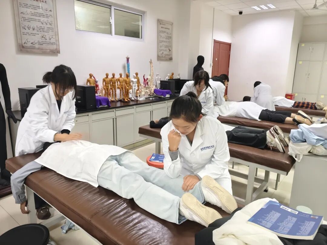结束晨练后,同学们到教室继续学习。大家聚焦揉法、滚法、推法等核心技艺,两两结对互为“医患”,在指尖触感与力度调控中,将《黄帝内经》经络学说与人体解剖知识转化为“手到痛减”的实操本领。从动作生疏到逐渐娴熟的每一步,让同学们真切感受到推拿治疗的魅力。