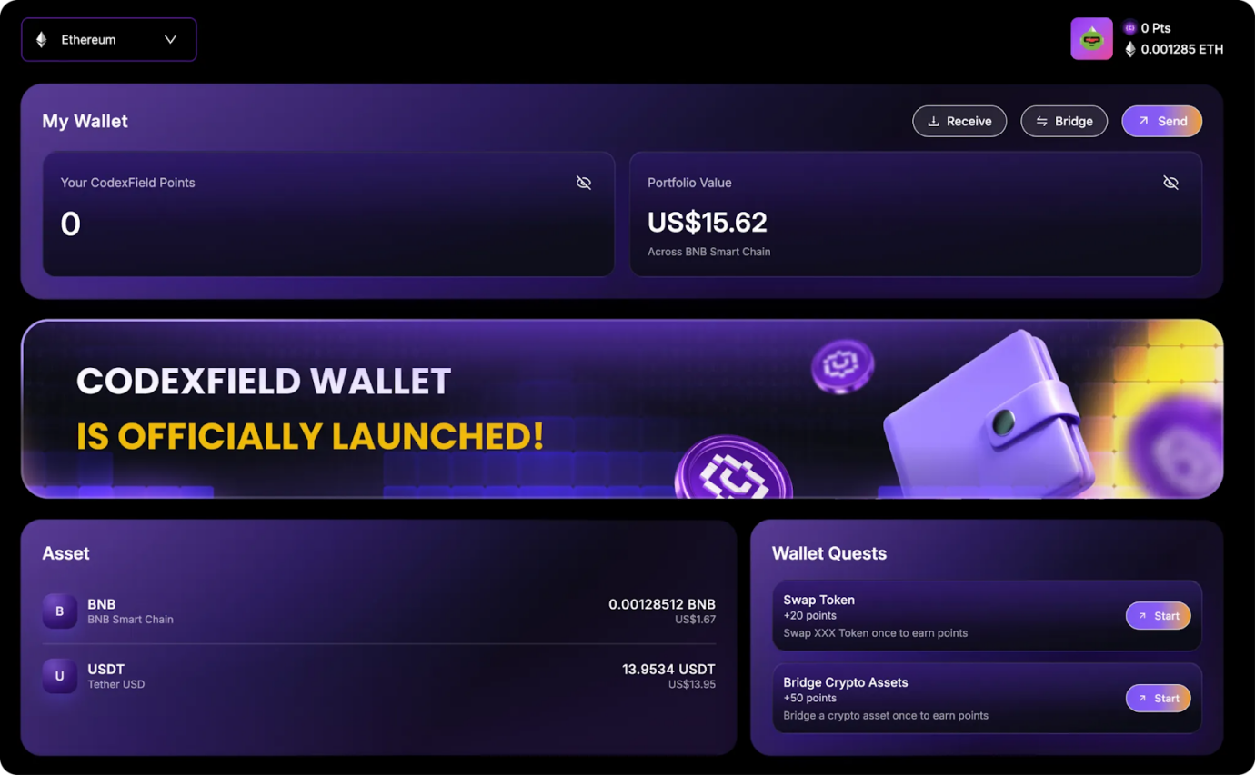 这些模块共同构成了 CodexField 的功能矩阵,但要使其形成一个能够真实运转的网络,需要一个统一的账户层将身份、资产与权限连接起来。Wallet 在这一点上发挥了枢纽作用。无论是上传代码、创建应用、购买资产,还是参与激励与收益分配,所有操作都在 Wallet 的账户体系中被验证、承载和执行。由此形成的统一逻辑,使创作、确权、调用、交易与收益记录得以贯通,并让整个生态具备“系统化运行”的结构。