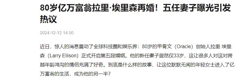 可如今,这位已经80岁的大佬却又被传出和一位年轻貌美的东北女孩结婚了,并且在网友的口中拉里·埃里森这神秘的第五任妻子被称为是“小邓文迪”。