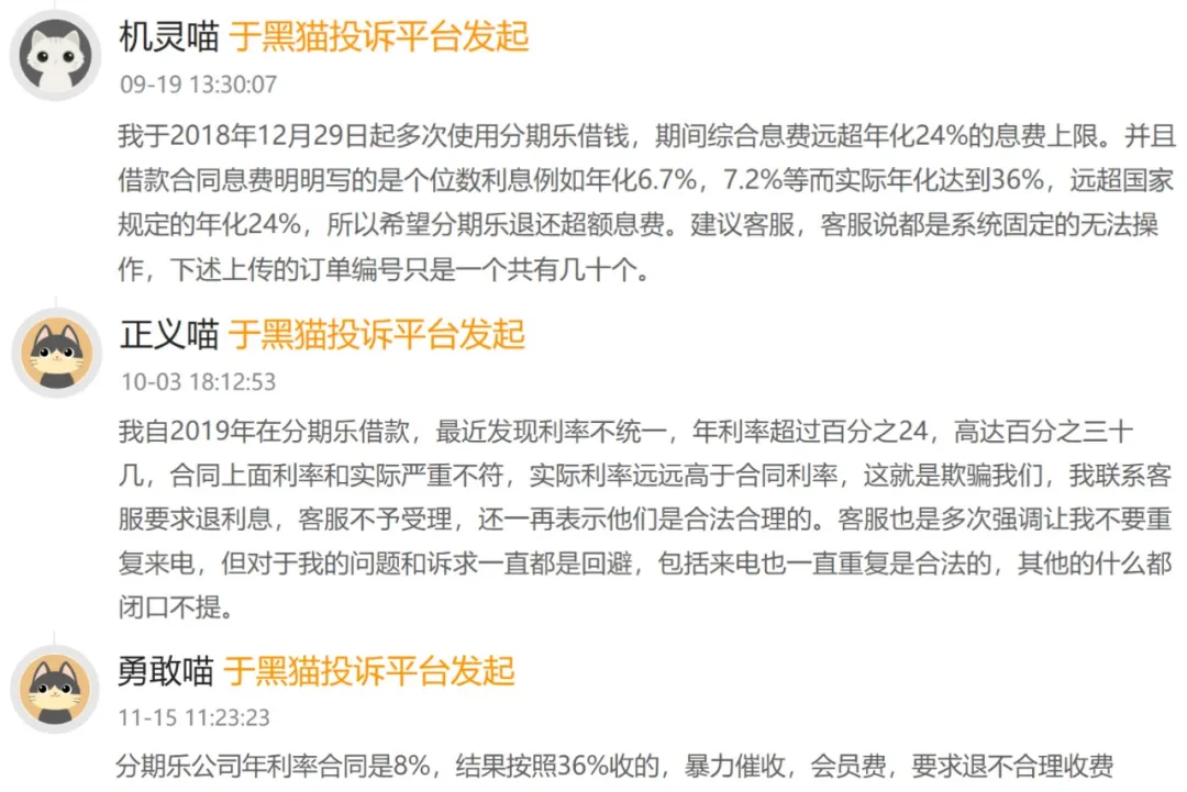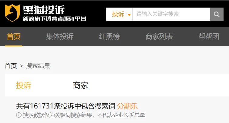 与之形成刺眼对比的,是黑猫投诉平台上超16万条针对分期乐的投诉,其中900余条与校园贷相关,2万余条直指暴力催收,更有无数用户控诉其违规收取高额息费。