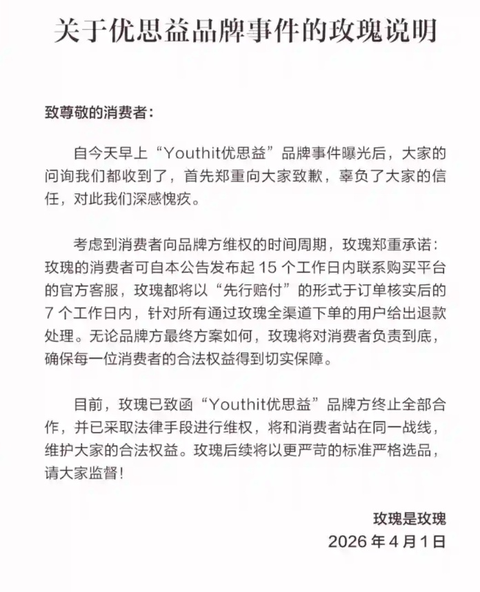 而事件的起因:4月1日,央视曝光了网红保健品“澳洲优思益(YouthIt)”涉嫌全面造假,紧接着,当天便通过直播间官微“彤享会”发布致歉声明,没有丝毫拖延、没有任何辩解,直面自己的选品失误,同时重磅宣布:凡是在她直播间和橱窗购买过优思益产品的用户,无论购买日期、无论是否开封,均可申请全额退款,正常情况下订单当天立刻到账,还专门设立了售后通道,让用户联系小助理办理,全程零门槛、不繁琐。