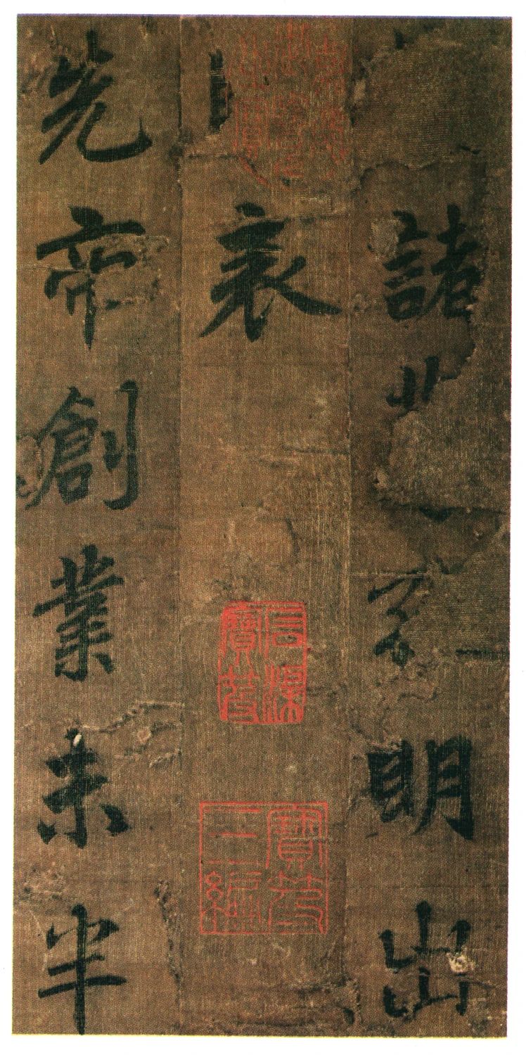 《出师表》墨迹,行书,无款绢本,割裂成册。原本现今收藏于台湾故宫博物院。此书前半部分有嘉庆御览之宝,宣统御览之宝,石渠宝笈等印,但后半部分及署款皆已残缺,因此难以考证书作者身份。然而,从书写的风格来看,书者名虽不可考,但其书势似李邕,清《滋蕙堂帖》曾刻,直署为李北海书。近人王壮为编入《中国书画》时,将其定为真迹。此册虽未见于宋明时期的著录,但其落笔结字庄峻有法,较《四言古诗卷》更为优秀。若与李邕的《法华寺》、《李思训》等碑相比,其神韵若合。然而,也有个别笔划不尽如意之处,如果此书并非李邕所书,则应为学邕书之高手。