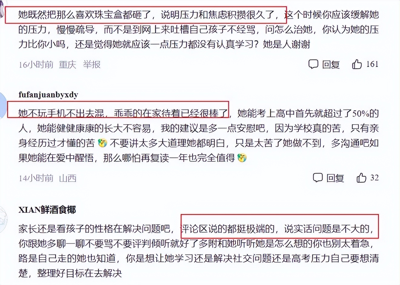 因此他出现的这种抑郁状态是应该被好好关注的,不少家长都觉得这位母亲的当务之急是带着高三女儿赶紧去看一个心理医生。