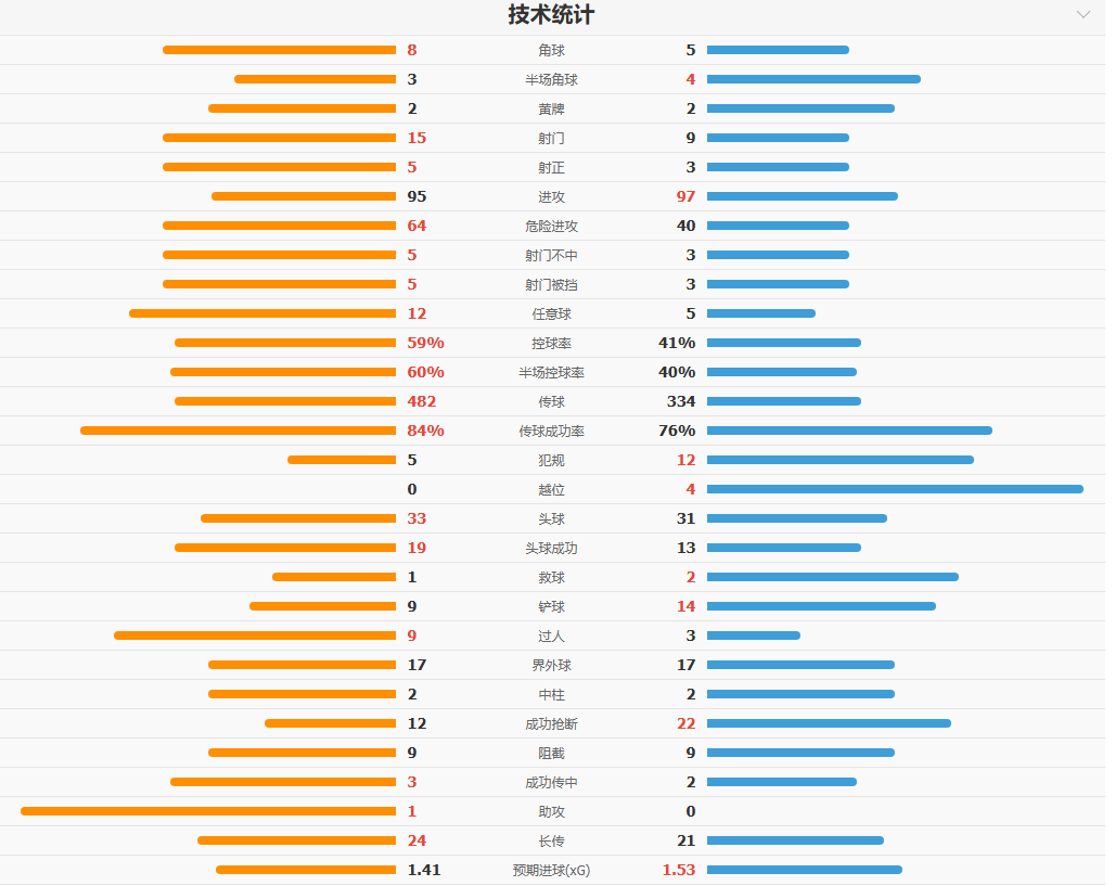 比赛尾声阶段,阿森纳依然有机会扳平。加布里埃尔的头球攻门击中门柱,这是本赛季英超首次出现双方均至少两次击中门框的比赛。补时阶段,哈弗茨获得绝佳头球机会,但却将球顶高,错失最后机会。